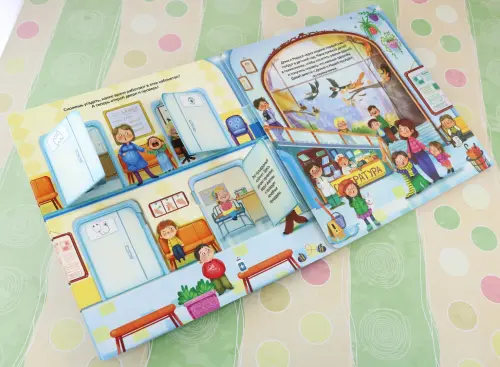 Отличный интерактив, но не в качестве досуга с малышом, как преподносит описание, а мягкое ознакомление с не самым приятным для ребенка местом. Книга знакомит маленького пациента со всеми этапами - от регистратуры до кабинета врача, включительно. Можно "открыть" окошки-кабинеты, посмотреть, а что там.