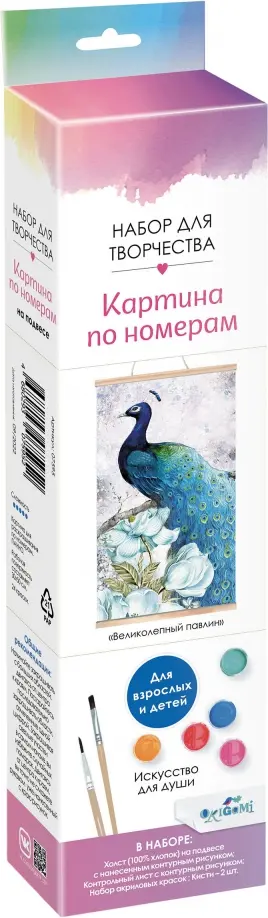 В наборе есть всё необходимое для создания шедевра: холст с контурным рисунком и подвесом, краски и кисточки.