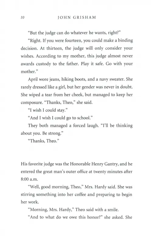 In the small city of Strattenburg, there are many lawyers, and though he's only thirteen years old, Theo Boone thinks he's one of them. Theo knows every judge, policeman, court clerk - and a lot about the law. He dreams of being a great trial lawyer, of a life in the courtroom. But Theo finds himself in court much sooner than he expected. Because he knows so much - maybe too much - he is suddenly dragged into the middle of a sensational murder trial. A cold-blooded killer is about to go free, and only Theo knows the truth. The stakes are high, but Theo won't stop until justice is served.