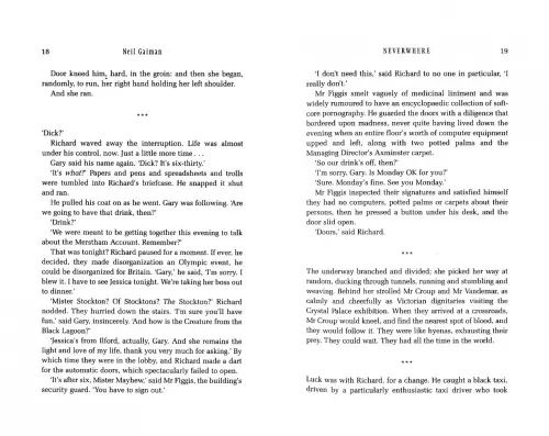 His act of kindness leads him to a place filled with monsters and angels, a Beast in a labyrinth and an Earl who holds Court in a Tube train.