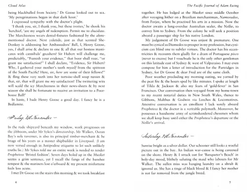 The novel features six characters in interlocking stories, each interrupting the one before it: a reluctant voyager crossing the Pacific in 1850; a disinherited composer blagging a precarious livelihood in between-the-wars Belgium; a high-minded journalist in Governor Reagan's California; a vanity publisher fleeing his gangland creditors; a genetically modified diner server on death-row; and Zachry, a young Pacific islander witnessing the nightfall of science and civilisation. The narrators of Cloud Atlas hear each other's echoes down the corridor of history, and their destinies are changes in ways great and small.