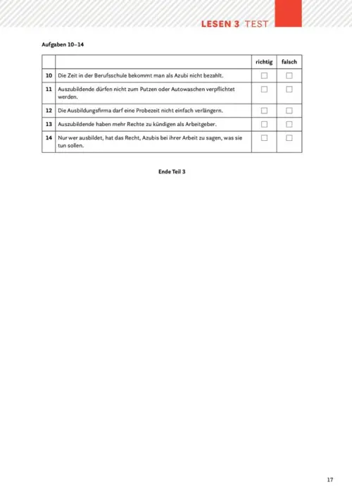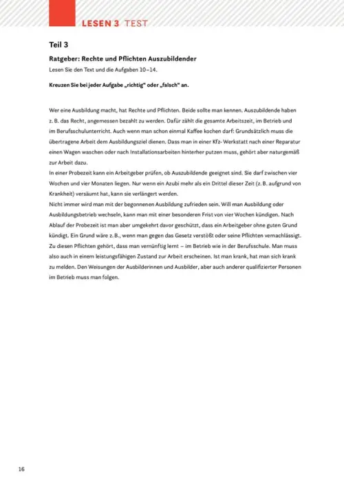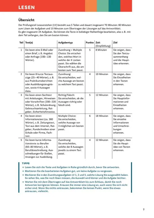 Das Buch enthält zwei Prüfungssätze: einer mit Hinweisen und Strategien für ein erfolgreiches Bestehen, einer ohne Tipps als Probelauf. Zudem finden sich im Buch kommentierte Lösungen mit Hinweisen, warum eine Lösung richtig oder falsch ist.