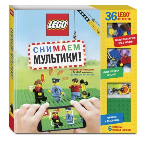 Мини-фигурки LEGO и реквизит в комплекте! 36 деталей, складные фоновые изображения, отрывные картинки-кадры. Стопроцентно официальное руководство LEGO по созданию покадровой анимации.