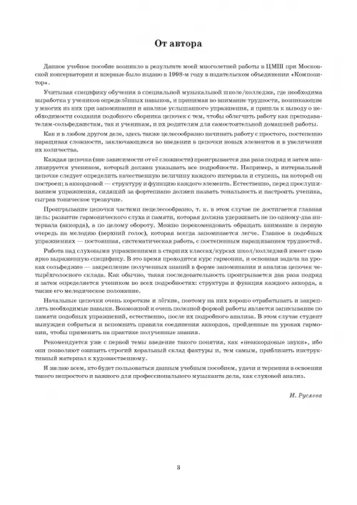 The textbook includes numerous chains: interval chains, chord chains, mixed and four-part chains, which were composed and tested by the author at solfeggio lessons in different classes at the Central Music School of the Moscow Conservatory. All material is divided into topics and levels, in accordance with the curriculum, and is arranged as it becomes more complicated — within each section.
