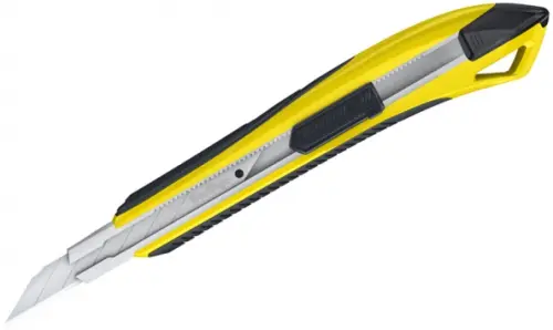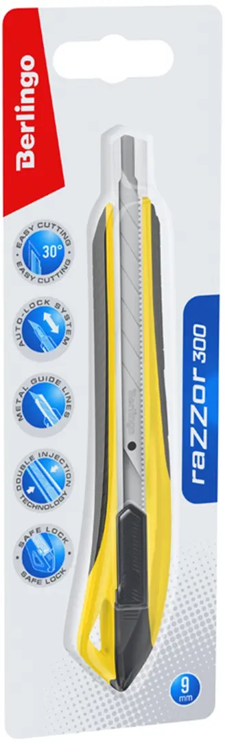 Канцелярский нож Berlingo серии Razzor 300 жёлтого цвета выполнен из высококачественного ABS пластика с применением технологии двойного литья (прорезиненные вставки). Имеет металлические направляющие. Ширина лезвия: 9 мм. Модель имеет автоматическую фиксацию лезвия AUTO-LOCK и дополнительно оснащена замком блокировки. Комплектуется износостойким лезвием из стали SK5 с углом 30°. Индивидуальная упаковка – блистер с европодвесом. На оборотной стороне блистера есть перфорация для более удобного извлечения инструмента из упаковки.