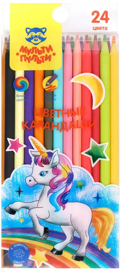 Карандаши цветные «Мульти-Пульти» серии «Единорог» – продукт, который дарит эмоции и настроение. Радость от рисования обеспечивает мягкий грифель классического диаметра 3 мм, что также увеличивает срок службы карандаша. В наборе представлены 24 цвета. Пластиковый корпус полностью прокрашен в цвет грифеля, отлично затачивается и добавляет дополнительной привлекательности. Карандаши упакованы в необычную прозрачную упаковку с ярким оформлением. Набор карандашей «Мульти-Пульти» подарит радугу эмоций и послужит отличным подарком ребенку! Товар предназначен для детей старше 3-х лет.