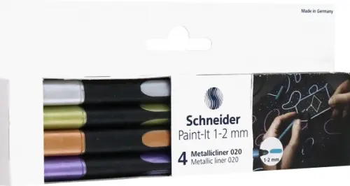 Набор линеров Schneider Paint-It 020 с чернилами металлик для творческих проектов DIY. Толщина линии: 1-2 мм. В набор входят 4 линера, цвета – ассорти. чернила быстро сохнут и практически не оставляют запаха. Корпус состоит на 88 % из пластмассы на основе биосырья. Линеры отлично подходят для леттеринга и каллиграфии, ведения ежедневников и дневников.