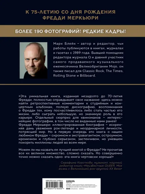 Британский журналист и писатель, автор публикаций в The Times, The Daily Telegraph и The Sunday Express Марк Блейк рассказывает удивительную биографию Фредди Меркьюри, подробно останавливаясь и на его детстве в Индии и Занзибаре, и на первых шагах к успеху в Лондоне, и на создании хитов и продумывании сценических образов, и на последних днях легенды.