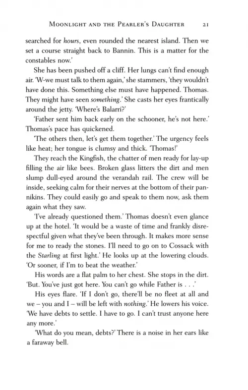 Ten years later and Charles Brightwell, now the bay's most prolific pearler, goes missing from his ship while out at sea. Whispers from the townsfolk suggest mutiny and murder, but headstrong Eliza, convinced there is more to the story, refuses to believe her father is dead, and it falls to her to ask the questions no one else dares consider.