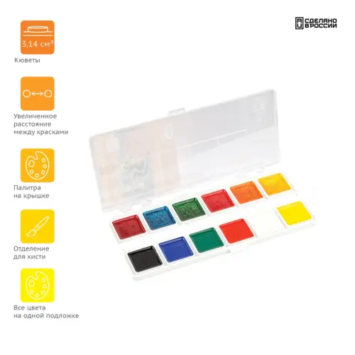 Кюветы с высокими бортиками и увеличенным расстоянием между красками предназначены для удобства в работе детей.