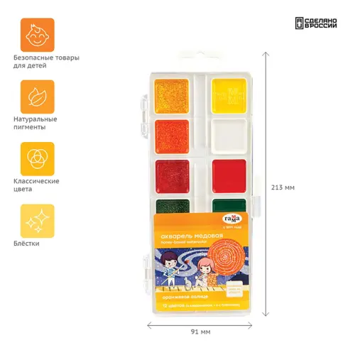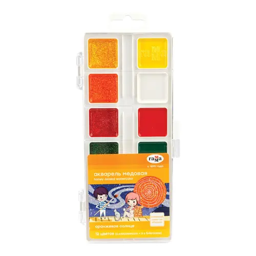 Медовая акварель "Оранжевое солнце" имеет расширенную палитру цветов, включающую классические цвета и цвета с различными эффектами.