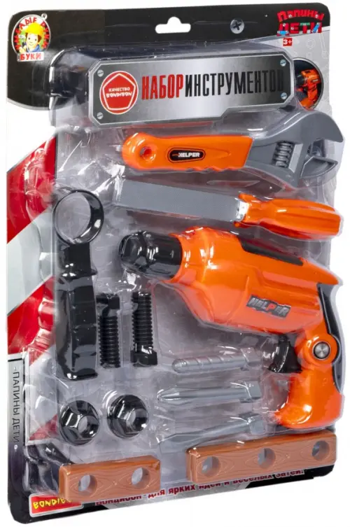 В комплекте игрового набора ПАПИНЫ ДЕТИ 13 предметов: электродрель с подсветкой и сменными насадками, которую можно использовать как шуруповерт, стамеска, разводной ключ, 2 болта с гайками, аксессуары для игры.