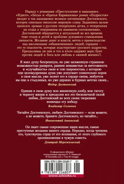 Наряду с романами "Преступление и наказание", "Идиот", "Бесы" и "Братья Карамазовы" роман "Подросток" входит в так называемое великое пятикнижие Достоевского, которое снискало писателю мировую славу. Задавшись целью написать роман "о русских теперешних детях, о теперешних их отцах в теперешнем их взаимном соотношении", Достоевский обращается к актуальной во все времена теме отцов и детей и проблеме духовного становления личности. Жажда денег и власти, мечта о превосходстве над миллионами "обыкновенных" людей, гордыня - это те опасности, которые подстерегают русского подростка. Преодолимы ли они и что в итоге одержит верх: бунт против людей и Бога или любовь к "живой жизни"?..