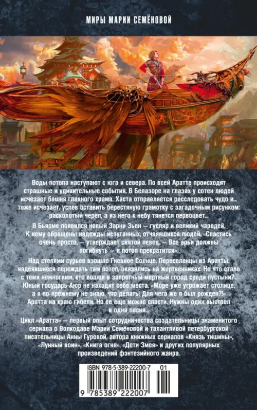 Воды потопа наступают с юга и севера. По всей Аратте происходят страшные и удивительные события. В Белазоре на глазах у сотен людей исчезает башня главного храма. Хаста отправляется расследовать чудо и... тоже исчезает, успев оставить берестяную грамотку с загадочным рисунком: расколотый череп, а из него к небу тянется первоцвет... В Бьярме появился новый Зарни Зьен - гусляр и великий чародей. К нему обращены надежды испуганных, отчаявшихся людей. "Спастись очень просто, - утверждает святой певец. - Все арьи должны погибнуть - и потоп прекратится". Над степями сурьев взошло Гневное Солнце. Переселенцы из Аратты, надеявшиеся переждать там потоп, оказались на жертвенниках. Но что стало с теми немногими, кто вошел в запретный мертвый город среди пустыни?.. Юный государь Аюр не находит себе места. "Море уже угрожает столице, а я по-прежнему не знаю, что делать! Для чего же я был рожден?!" Аратта на краю гибели. Но ее еще можно спасти. Нужны один выстрел и одна песня... Цикл "Аратта" - первый опыт сотрудничества создательницы знаменитого сериала о Волкодаве Марии Семёновой и талантливой петербургской писательницы Анны Гуровой, автора книжных сериалов "Князь тишины", "Лунный воин", "Книга огня", "Дети Змея" и других популярных произведений фэнтезийного жанра.