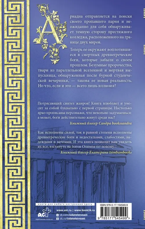 Ариадна отправляется на поиски своего пропавшего парня и неожиданно для себя обнаруживает темную сторону престижного колледжа, расположенного на границе двух миров. Теперь ее окружают воплотившиеся в смертных древнегреческие боги, которые забыли о своем прошлом. Безумные пророчества, твари из параллельной вселенной и мертвая выпускница, обнаруженная после бурной студенческой вечеринки, — такова ее реальность. Но что, если и это - всего лишь иллюзия?