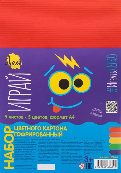 Набор цветного гофрированного картона Лео - это идеальный выбор для детского творчества и хобби: создание аппликаций, украшений, открыток и различных поделок. Этот вид творчества отлично развивает мелкую моторику, творческие способности, тренирует память и логическое мышление ребенка. Набор цветного гофрированного картона производится в соответствии с требованиями ТР ТС 007/2011 "О безопасности продукции, предназначенной для детей и подростков", не имеет срока годности. Лист картона хорошо складывается, не осыпается, легко приклеивается и режется ножницами. Гофрированный картон идеально сочетается в поделках как с цветной бумагой, так и с картоном. С его помощью поделка или аппликация выглядит объемнее и реалистичнее. Набор цветного гофрированного картона Лео - создавай шедевры с удовольствием! Рекомендовано для уроков труда и технологии. Картон в полиэтиленовом пакете, формат листов А4. Плотность картона - 165 г/м2. Тип картона - гофрированный. Набор содержит 5 листов, 5 ярких насыщенных цветов: желтый, оранжевый, красный, зеленый, синий