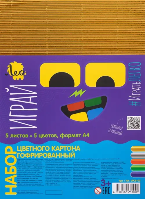Набор цветного гофрированного картона Лео - это идеальный выбор для детского творчества и хобби: создание аппликаций, украшений, открыток и различных поделок. Этот вид творчества отлично развивает мелкую моторику, творческие способности, тренирует память и логическое мышление ребенка. Набор цветного гофрированного картона производится в соответствии с требованиями ТР ТС 007/2011 "О безопасности продукции, предназначенной для детей и подростков", не имеет срока годности. Лист картона хорошо складывается, легко приклеивается и режется ножницами. Гофрированный картон идеально сочетается в поделках как с цветной бумагой, так и с картоном. С его помощью поделка или аппликация выглядит объемнее и реалистичнее, а металлизированные цвета, входящие в набор, позволят придать поделке больше блеска и волшебного сияния. Набор цветного гофрированного картона Лео - создавай шедевры с удовольствием! Рекомендовано для уроков труда и технологии. Картон в полиэтиленовом пакете, формат листов А4. Плотность картона - 260 г/м2. Тип картона - гофрированный. Набор содержит 5 листов, 5 ярких насыщенных цветов: золото, серебро, красный, зеленый, синий.