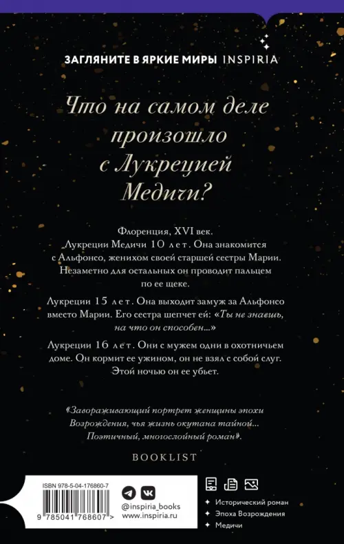 Наполненный красотой и изяществом исторический роман о судьбе Лукреции Медичи. Италия эпохи Ренессанса оживает на страницах книги Мэгги О'Фаррелл, автора международных бестселлеров.