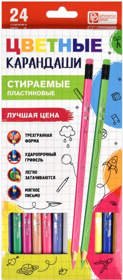 Набор цветных карандашей пластиковых (24 цв., размер: 18,8х9,2х1,7 см, форма корпуса: трёхгранная, материал корпуса: пластик, отделка: серебряное тиснение на корпусе, диаметр грифеля: 2,65 мм, заточенные, с ластиком на каждом карандаше, стираемые), картонная коробка с европодвесом и вырубкой