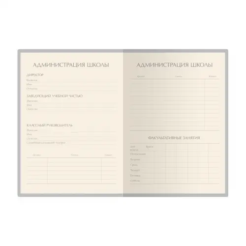 Внутренний блок напечатан на бумаге белого цвета плотностью 70 г/кв.м. Помимо основного раздела с шестидневной учебной сеткой, он содержит страницу для персональных данных, раздел для внесения информации об администрации школы, расписания уроков по четвертям, факультативным занятиям. Всего 48 листов.
