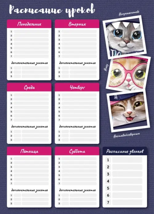 Если вы обнаружили ошибку в описании товара «Расписание уроков Коты, А3», то выделите её мышкой и нажмите Ctrl+Enter. Спасибо, что помогаете нам стать лучше!