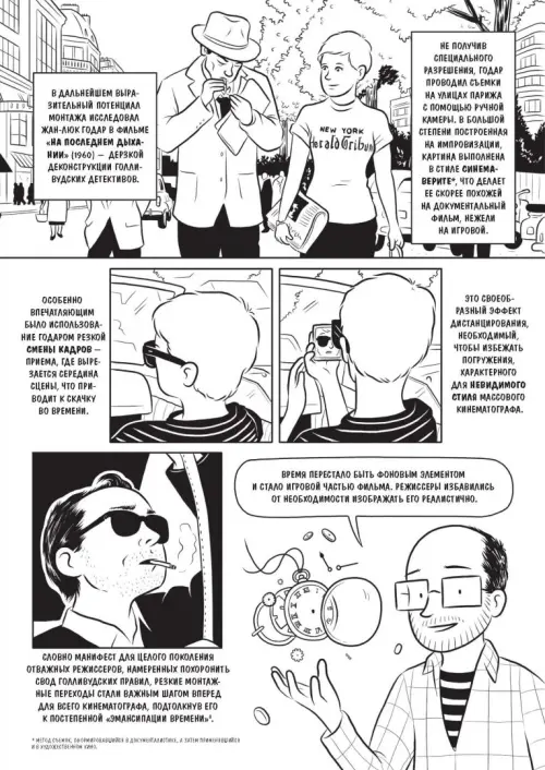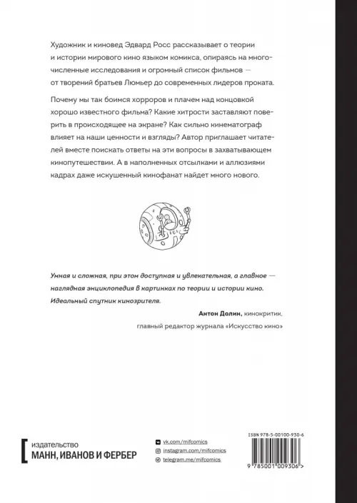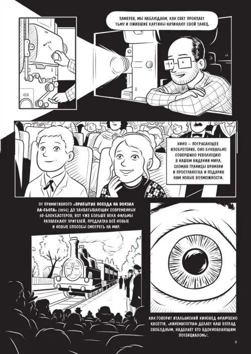 Используя язык комикса, автор рассказывает об истории и современных теориях кинематографа с трогательной интонацией заядлого кинофаната, не разрушая магию кино, но дополняя ее новыми оттенками. Разделив книгу на 7 тематических глав (Глаз, Тело, Декорации и архитектура, Время, Язык и голос, Идеология и власть, Технологии и технофобия), Росс смешивает в своем исследовании классику мирового кинематографа (Хичкок, Чаплин, "Гражданин Кейн"), массовое кино ("Терминатор", "Чужой") и арт-хаус ("Быть Джоном Малковичем", "Вальс с Баширом").