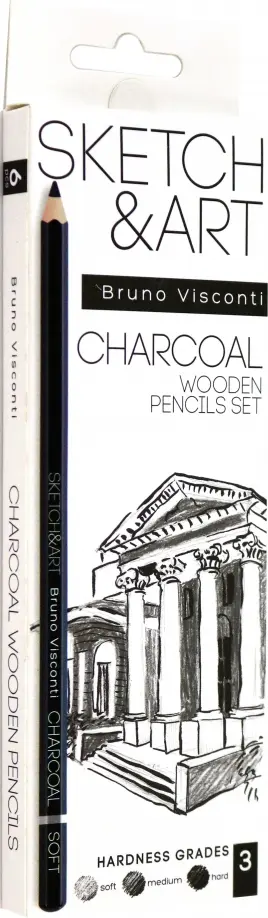 Набор угольных карандашей разной степени мягкости: мягкий, средний, твердый.