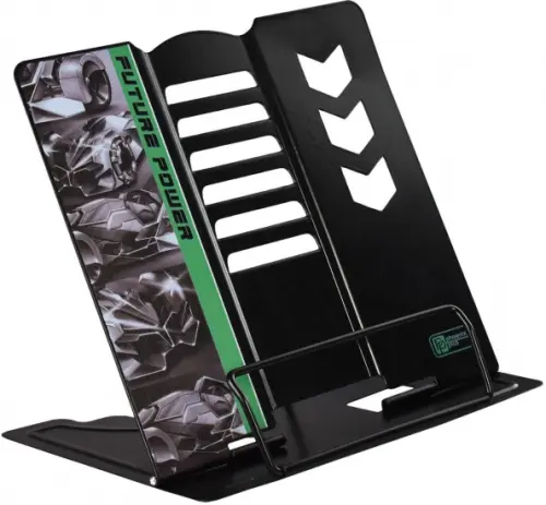 Подставка для книг и учебников (19х20х15.5 см, окрашенный чёрный металл, количество углов наклона: шесть, прижим для фиксации страниц: есть, УФ-печать, фигурная вырубка, ПЭТ-пакет).