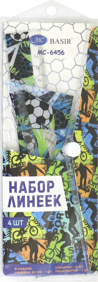 Набор линеек: "Спорт"; 4 предмета: пластиковые с рисунком; 2 треугольника, транспортир, линейка 20 см; упаковка ПВХ-конверт на кнопке.
