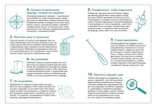 «Frilu+ sliv, или пребывание на открытом воздухе, — это встреча природы и человека и то ценное, что мы в это время создаем; проще говоря, выстраивание личных отношений с природой через прямое взаимодействие. Какой способ выбрать, решайте сами. Frilu+ sliv может быть совсем незамысловатым, как вечерняя прогулка по окрестностям, или очень продвинутым, как многодневный поход с рюкзаком в далекие и дикие места, может быть чем-то средним между тем и другим. Можно наслаждаться им в одиночестве, можно с друзьями или семьей, а можно и в компании единомышленников. Это знакомство с природой, но без расписания и теоретических занятий в классе. Это практика, передача знаний и полезных навыков от одной встречи к другой, от одного поколения к другому». (Линда Окесон-Макгёрк)