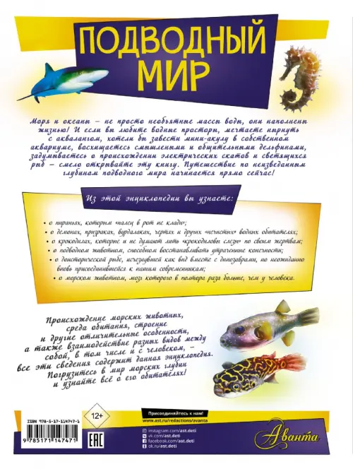 Эта большая энциклопедия открывает юным читателям тайны подводного мира и его обитателей. Здесь рассказывается о жителях глубин и отмелей, береговой линии суши и надводных скал, соленых и пресных вод - представителях всех широт и концов света! Некоторых животных, с которыми знакомит книга, невозможно встретить в повседневной жизни, даже в зоопарке или океанариуме. Тем интереснее будет узнать, какие жители морей самые "разговорчивые", что за "электрики" водятся в океане, где живет прабабушка современных рыб, какое подводное существо, как и кенгуру, носит сумку для детей, какую рыбу назвали "в честь" птицы, а какой дали целых три имени и многое, многое другое!