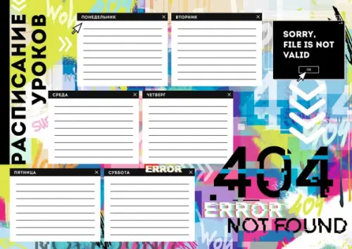 Если вы обнаружили ошибку в описании товара «Расписание уроков Ошибка 404, А4», то выделите её мышкой и нажмите Ctrl+Enter. Спасибо, что помогаете нам стать лучше!