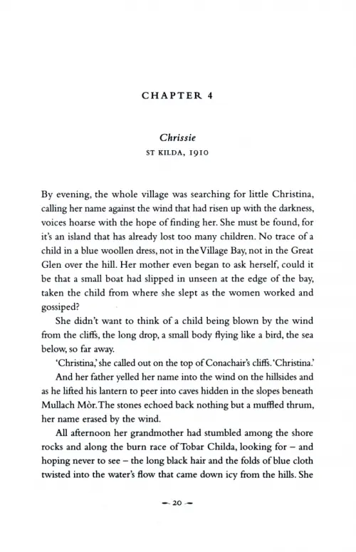 Chrissie Gillies comes from the last ever community to live on the beautiful, isolated Scottish island of St Kilda. Evacuated in 1930, she will never forget her life there, nor the man she loved and lost who visited one fateful summer a few years before.