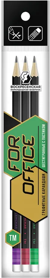 Набор графитных карандашей с ластиком заточенные ТМ "ВКФ" "For Office" с градацией твердости ТМ(НВ) в пакете с европодвесом. Изготовлены из сырья и материалов природного происхождения и качественной химически необработанной древесины мелколистной липы, выращенной в экологически чистых районах России. Не токсичны.