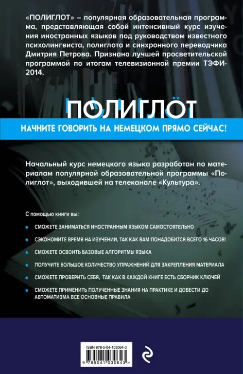 Начальный курс немецкого языка разработан по материалам популярной образовательной программы "Полиглот", выходившей на телеканале "Культура". В печатной версии курса даны упражнения, основные правила произношения и сведения о глаголах. С помощью шестнадцати уроков по методике Дмитрия Петрова вы сможете освоить базовые алгоритмы языка, применить их на практике и довести до автоматизма. В помощь тем, кто занимается самостоятельно, предлагается полный сборник ключей, т.е. выполненных упражнений. Теперь читатели смогут проверить, правильно ли они усвоили грамматические правила, и внести необходимые коррективы в процесс изучения языка.