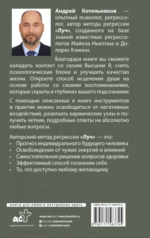Андрей Котельников — опытный психолог, регрессолог, автор метода регрессии «Луч», созданного на базе знаний известных регрессологов Майкла Ньютона и Долорес Кэннон.