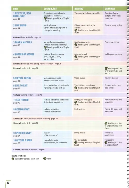 'Teen-appeal' topics combined with extensive preparation for A2 Key for Schools, B1 Preliminary for Schools, B2 First for Schools and C1 Advanced.