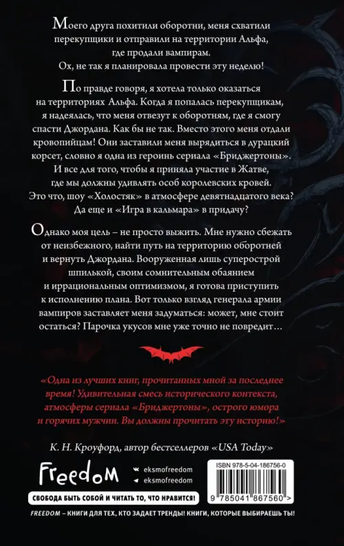 По правде говоря, я планировала только оказаться на территории Альфа. Когда я попалась перекупщикам, я надеялась, что меня отвезут к оборотням, где я смогу спасти Джордана. Как бы не так. Вместо этого меня отдали кровопийцам! Они заставили меня вырядиться в дурацкий корсет, словно я одна из героинь сериала «Бриджертоны». И все для того, чтобы я приняла участие в Жатве, где мы должны удивлять особ королевских кровей. Это что, шоу «Холостяк» в атмосфере девятнадцатого века? Да еще и «Игра в кальмара» в придачу?