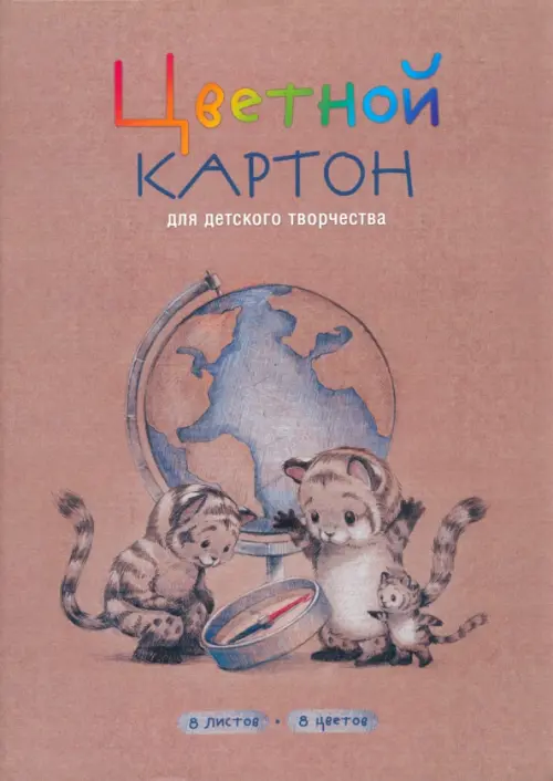 Картон цветной мелованный Тигрята у глобуса, 8 цветов, 8 листов