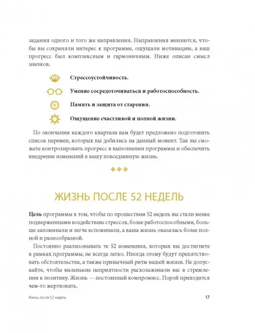 Идея книги проста: на протяжении 52 недель каждую неделю добивайтесь одного маленького позитивного изменения в образе вашей жизни, и к концу года вы будете менее подвержены воздействию стрессов, станете более работоспособными, будете больше запоминать, защитите себя от болезней и процесса старения и будете ощущать вашу жизнь более наполненной и разнообразной. Изложенная в этой книге программа дает вам целый год на то, чтобы постепенно достигнуть изменений, которые со временем впишутся в ваш образ жизни и станут для вас привычными. Следовательно, повышаются шансы того, что позитивные изменения в вашей жизни будут носить долговременный и постоянный характер.