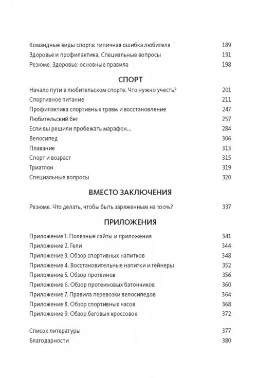 При этом подразделы про бег и плавание, например, есть и в разделе "Спорт". Противоречие? Повторы? Нет. Раздел "Спорт" - для спортсменов-любителей, тех, кто не только занимается спортом для здоровья, но и участвует в любительских соревнованиях, хочет бегать, плавать или ездить быстро и улучшать свои результаты. Если вы относитесь к таким любителям - уверены, найдете много полезного в последнем разделе книги, что поможет вам улучшить результаты и при этом избежать травм.