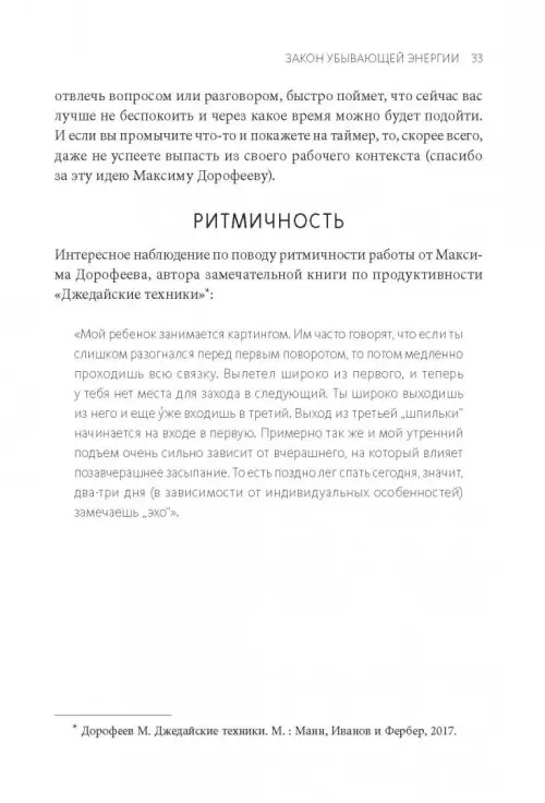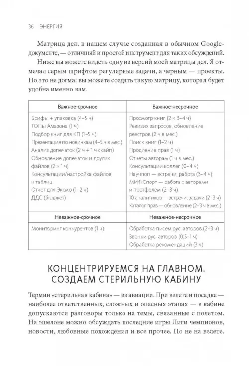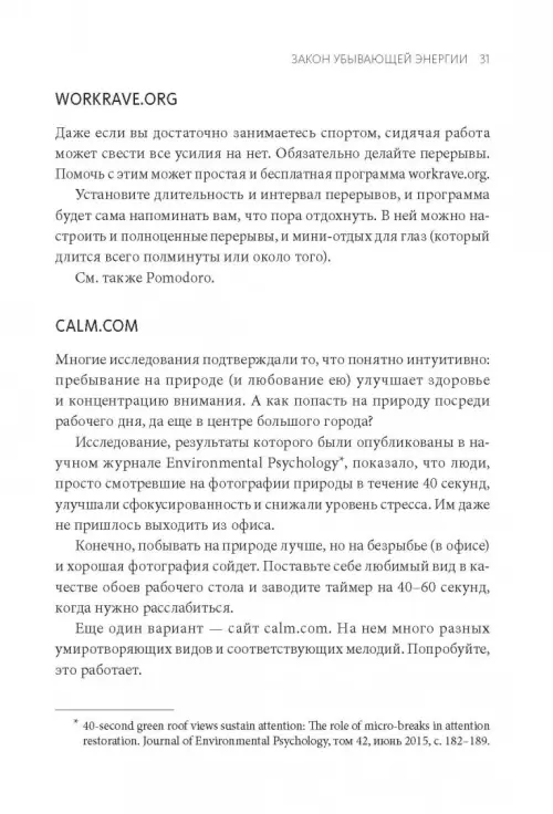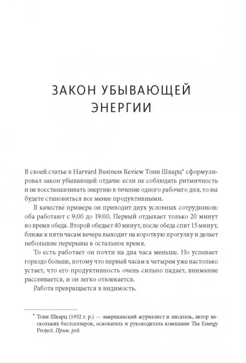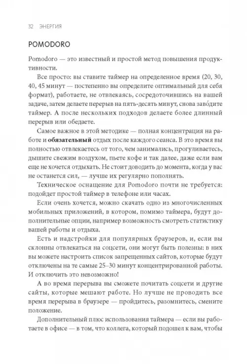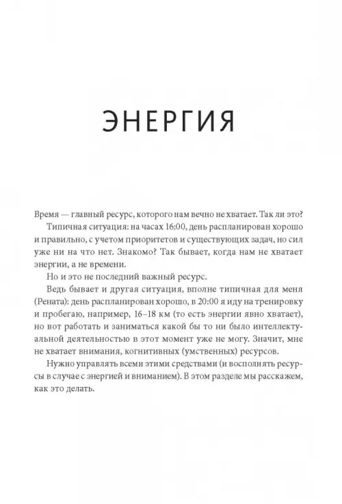 Раздел "Энергия" содержит советы и приемы, которые помогут вам сохранять продуктивность и энергичность в течение всего рабочего дня - до вечера, а не 4 часов дня. Неважно, руководитель вы, спортсмен, специалист, домохозяйка, шофер: этот раздел поможет вам сберечь внимание и энергию, работать и отдыхать на 100%.