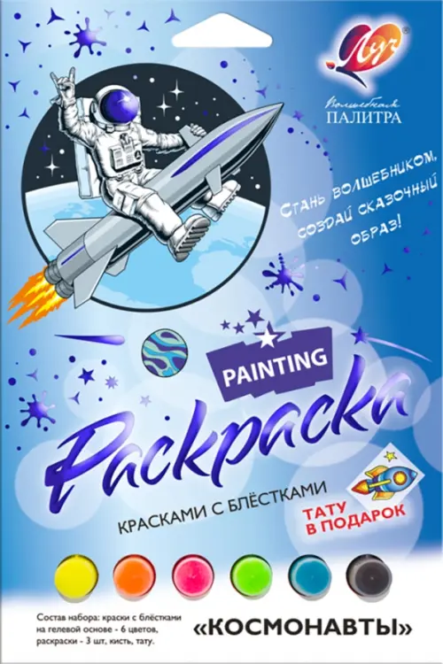 Набор для раскрашивания ЛУЧ "Космонавты" из серии "Волшебная палитра" - это новая версия наборов для росписи с флуоресцентными красками с добавлением глиттера (блесток).
