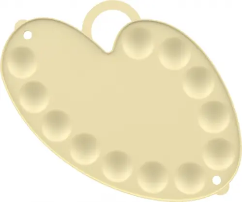 - Пластмассовую палитру легко держать в руке, она имеет отверстие для большого пальца руки, 12 круглых ячеек ячейки для красок и площадку для их смешивания, что даёт художнику большую свободу для творчества.