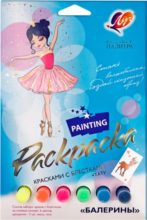 Больше блёсток!Если вы обнаружили ошибку в описании товара «Набор красок с блестками с раскраской Балерины», то выделите её мышкой и нажмите Ctrl+Enter. Спасибо, что помогаете нам стать лучше!