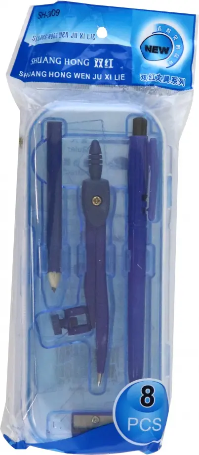 Готовальня 8 предметов: циркуль металлический, карандаш, ручка, точилка, линейка 15см, транспортир, 2 треугольника, в пластиковом прозрачном корпусе