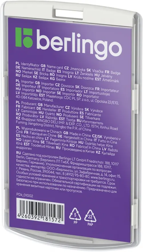 Бейдж Berlingo серии "ID 300" выполнен из плотного ABS пластика, поэтому не помнется в кармане или в сумке. Внутри бейджа находится бумажный вкладыш размером 85*55мм, на лицевой стороне которого указана выходная информация о товаре и шк/артикул для продажи, а оборотная сторона вкладыша подготовлена под персонализацию. Подходит для хранения пропуска, визитной карточки или проездного билета. Поставляется без держателя в комплекте, в светло-сером цвете. Каждый бейдж упакован в индивидуальный пакет для защиты от пыли и грязи. Идеально сочетается с любым лентами или держателями для бейджей Berlingo.