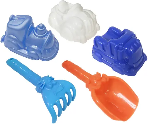 В набор входят совок и грабельки с красивыми рельефными ручками, а также 3 цветные формочки в виде машинок.