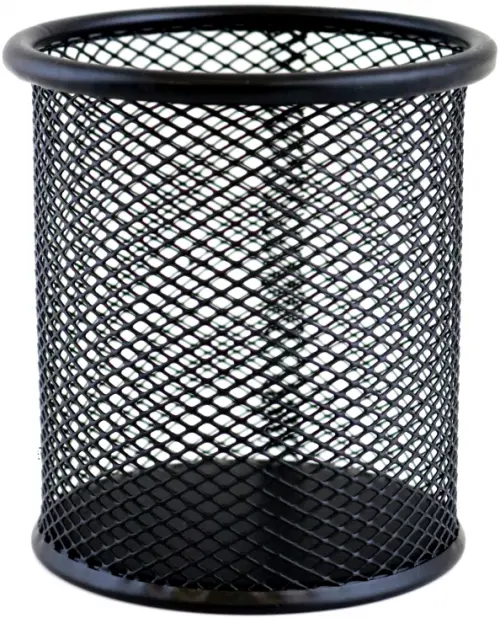 Подставка для канцелярских принадлежностей: стакан с круглой формой основания, материал-стальная сетка, чёрного цвета, размер 10*8 см.