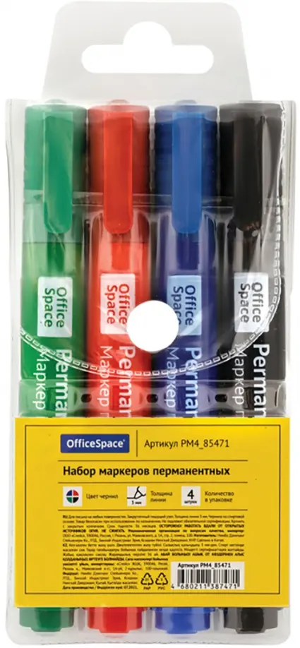 Набор маркеров OfficeSpace предназначен для письма на любых поверхностях, в том числе по пластику, стеклу, рамкам слайдов, плёнкам, рентгеновским снимкам и т. д. Толщина линии: 3 мм. Плотный колпачок с клипом надёжно предотвращает высыхание. Маркеры упакованы в ПВХ чехол. Пулевидный пишущий узел. Хранить с закрытым колпачком.